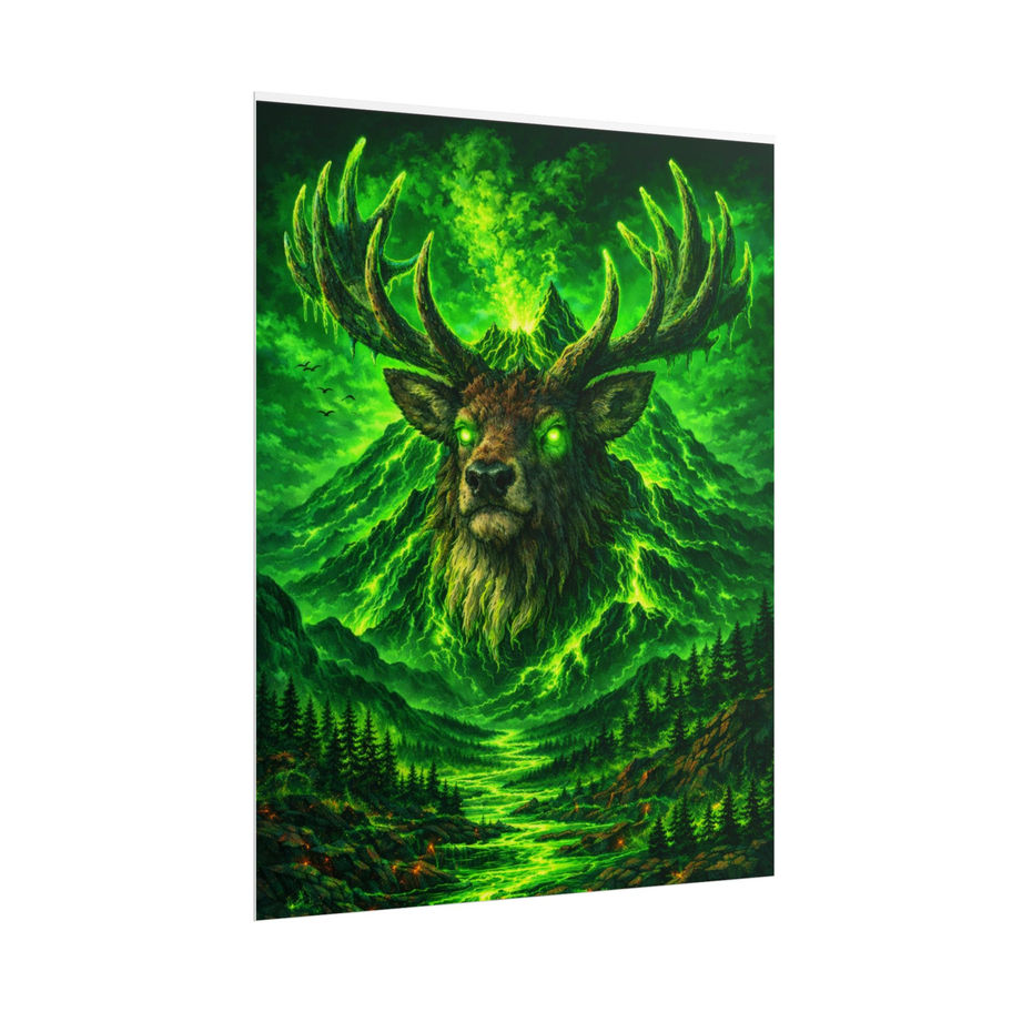 This rolled poster brings a deep, otherworldly forest scene into your space: a monumental elk with glowing eyes rises from swirling green mountains and mist, rendered in rich, saturated tones that feel alive. Printed with museum-quality giclée options, the texture and color depth make the artwork read like a window into a mythic landscape. Hang it in a study, studio, or living room to anchor a nature-inspired or fantasy-themed display. The vertical composition and dramatic contrast draw the eye, inviting quiet focus or conversation. Whether layered with frames or pinned raw from the roll, it adds a touch of wild, luminous atmosphere where you live or create.