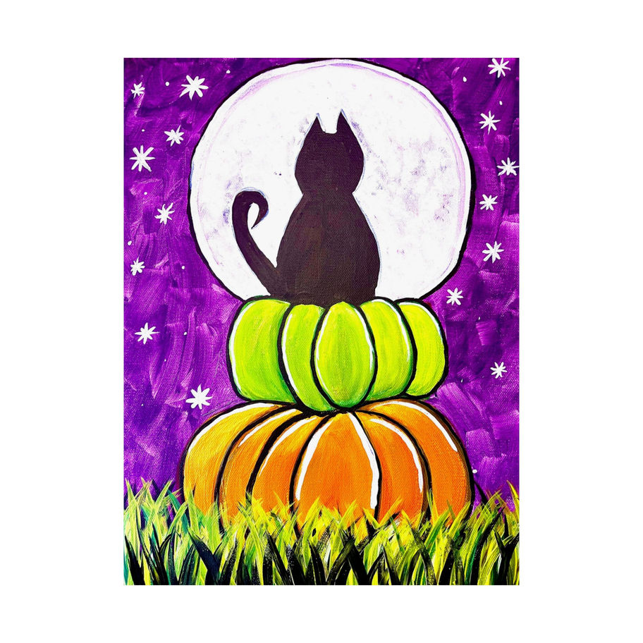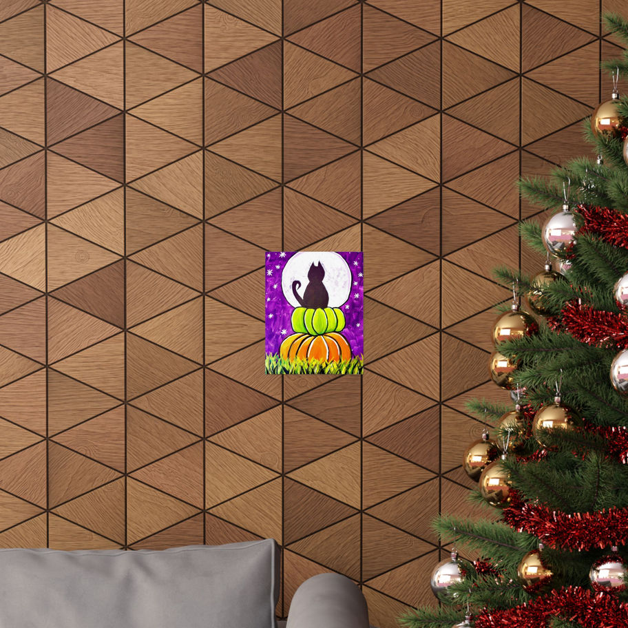 This matte vertical poster brings a whimsical, autumn-night scene into any indoor space. A silhouetted cat sits atop two stacked pumpkins beneath a large, glowing moon, set against a rich purple sky dotted with stars. The matte finish softens glare and adds a painterly, gallery-quality feel, while museum-grade archival paper and giclée printing keep colors vibrant and true over time. It’s the sort of artwork that quietly transforms a corner into a cozy seasonal vignette — think warm evenings, pumpkin-scented memories, and gentle moonlit moments.
